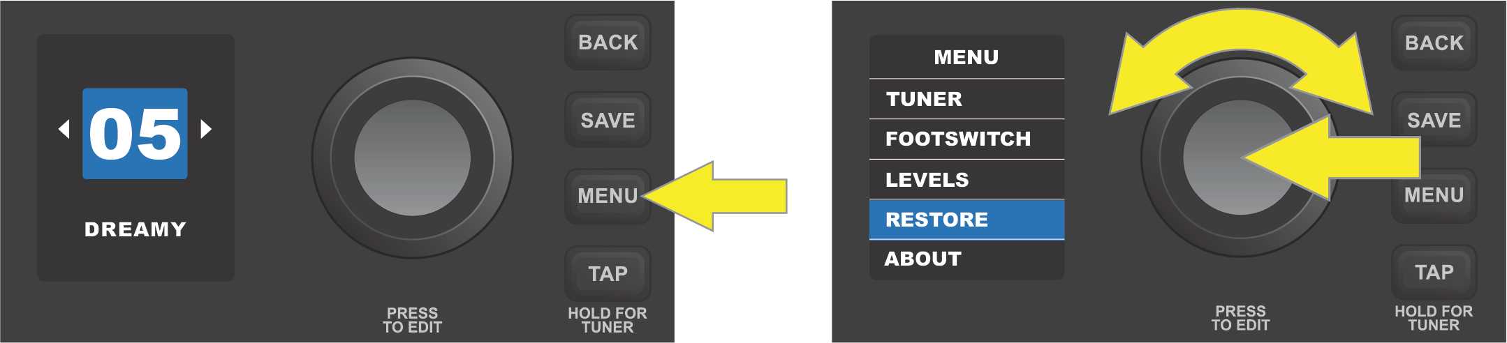 The fourth MENU function—RESTORE—enables restoration of all original factory presets and amplifier settings. To do this, press the MENU utility button, then use the ENCODER to scroll to and select RESTORE: