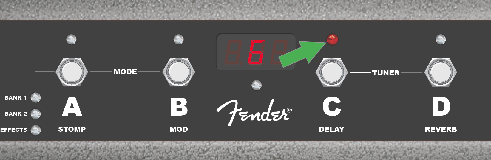 To activate the footswitch tuning function, step on buttons “C” and “D” simultaneously (double yellow arrow). In the example above, a “G” note is displayed as being particularly flat, as indicated by the illumination of the red LED above button “A” (green arrow).
