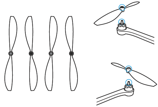 Securely tighten the propellers. Propellers are color-coded to match the correct motors.
