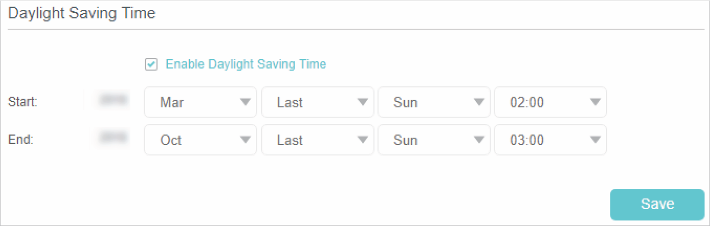 After setting the system time, you can set Daylight Saving time according to your needs. Tick the checkbox to enable Daylight Saving, set the start and end time and then click Save to make the settings effective.