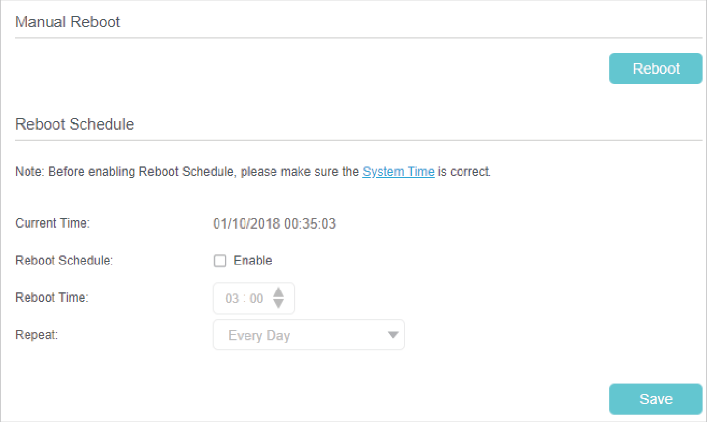 The Reboot Schedule feature cleans the cache to enhance the running performance of the router. You can reboot the router manually or set it to reboot regularly.