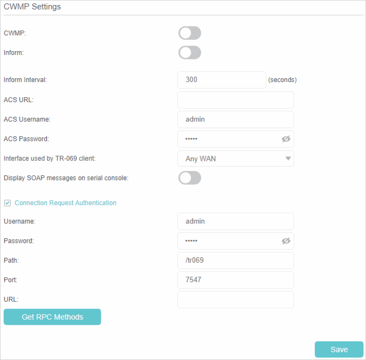 Enable CWMP - Toggle On to enable the CWMP (CPE WAN Management Protocol) feature.