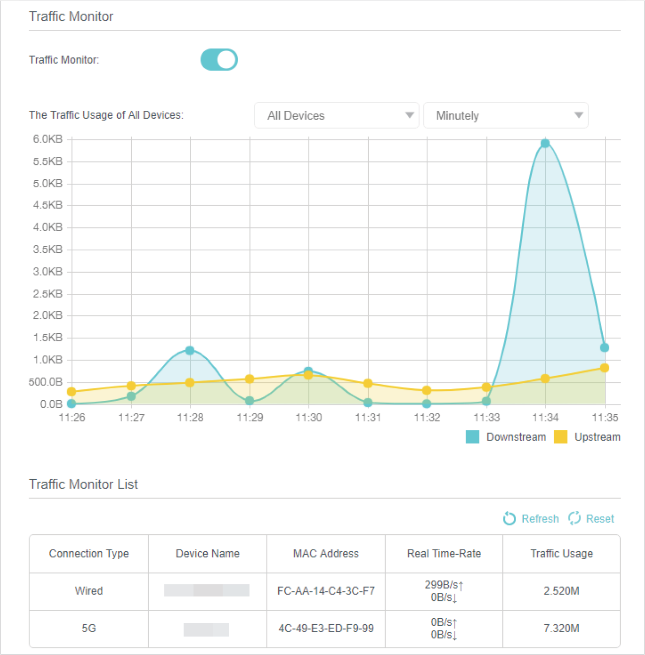Toggle on Traffic Monitor, and then you view the traffic usage of a device in the past 10 minutes or that of all devices in the past 10 minutes/24 hours/7 days.