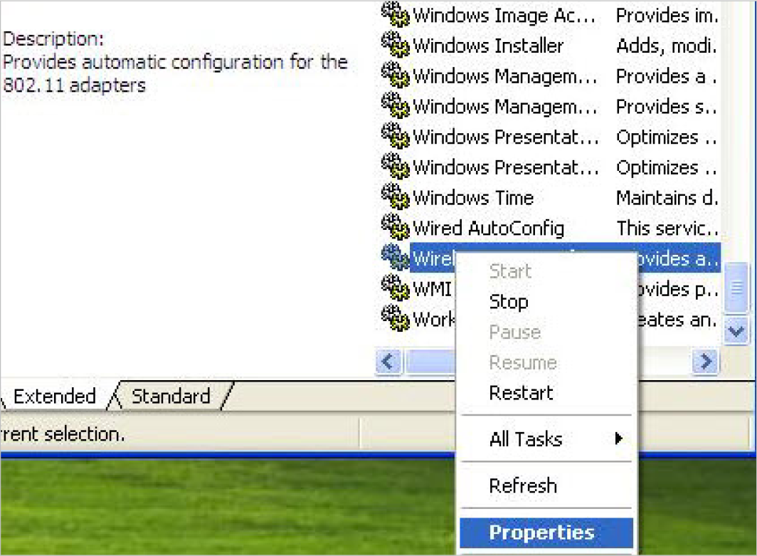 ) Select Wireless Zero Configuration, right click it, and then select Properties;