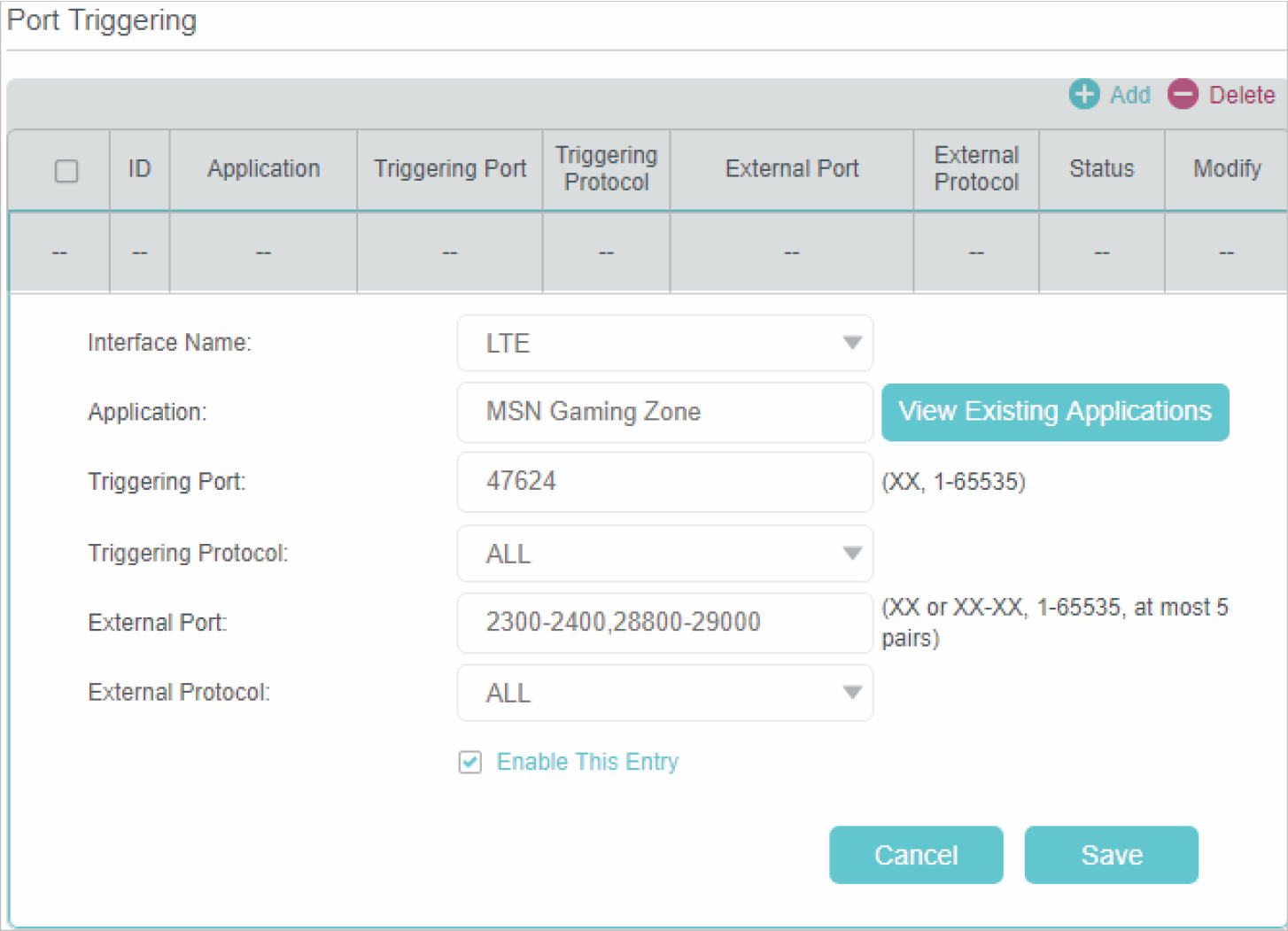 Click View Existing Applications, and select the desired application. The triggering port and protocol, the external port and protocol will be auto-populated. Here we take application MSN Gaming Zone as an example.