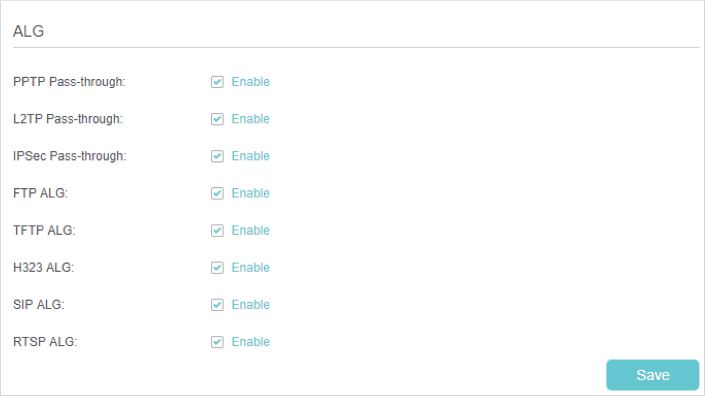 ALG (Application Layer Gateway) allows customized NAT (Network Address Translation) traversal filters to be plugged into the gateway to support address and port translation for certain application layer “control/data” protocols: FTP, TFTP, H323 etc. Enabling ALG is recommended.