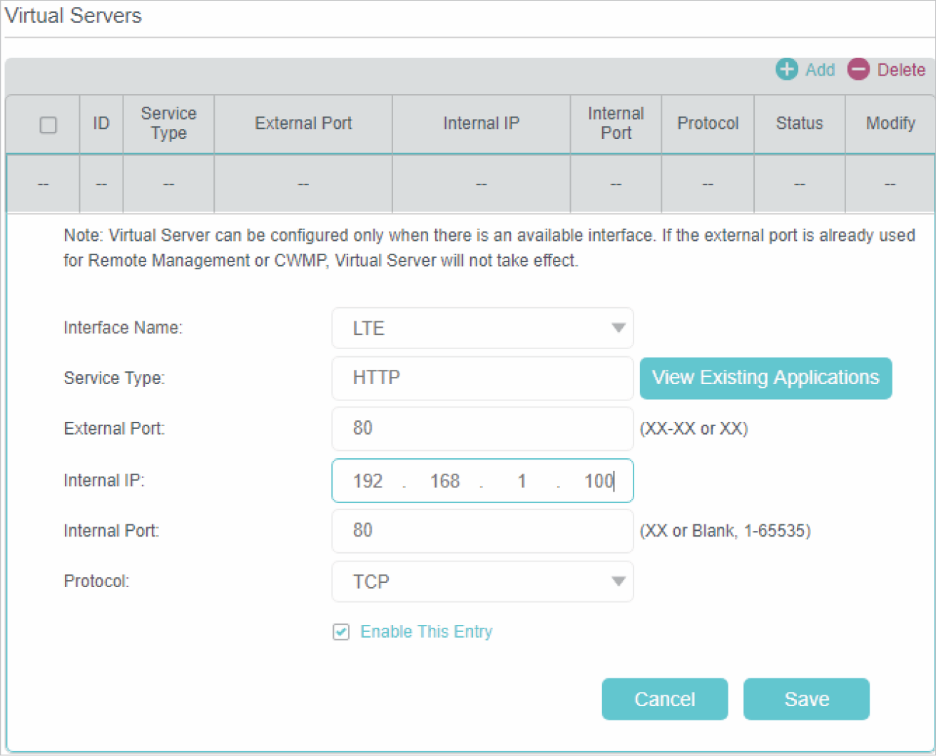 Click View Existing Services, and choose HTTP. The external port, internal port and protocol will be auto-populated. Enter the PC’s IP address 192.168.1.100 in the Internal IP field.