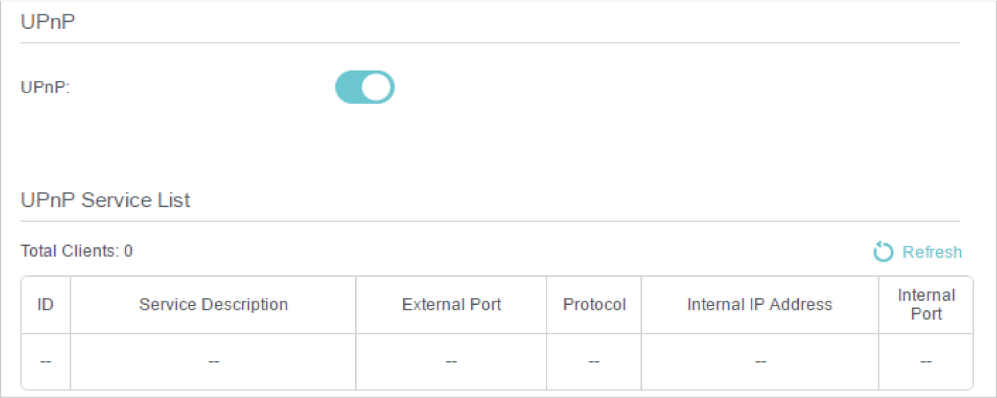 UPnP (Universal Plug and Play) protocol allows the applications or host devices to automatically find the front-end NAT device and send request to it to open the corresponding ports. With UPnP enabled, the applications or host devices in the both sides of NAT device can freely communicate with each other, realizing the seamless connection of the network. You may need to enable the UPnP if you want to use applications for multiplayer gaming, peer-to-peer connections, real-time communication (such as VoIP or telephone conference) or remote assistance, etc.