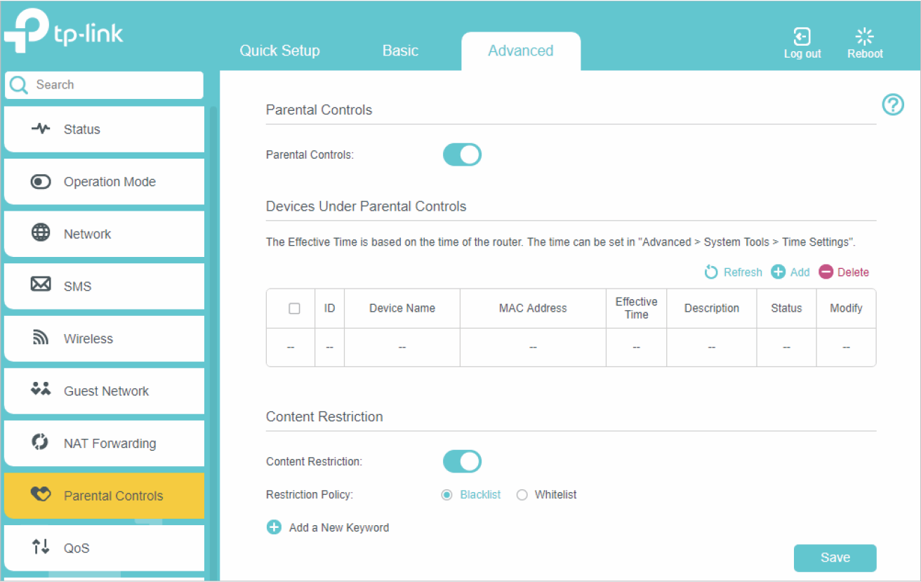 Go to Basic or Advanced > Parental Controls and enable Parental Controls.