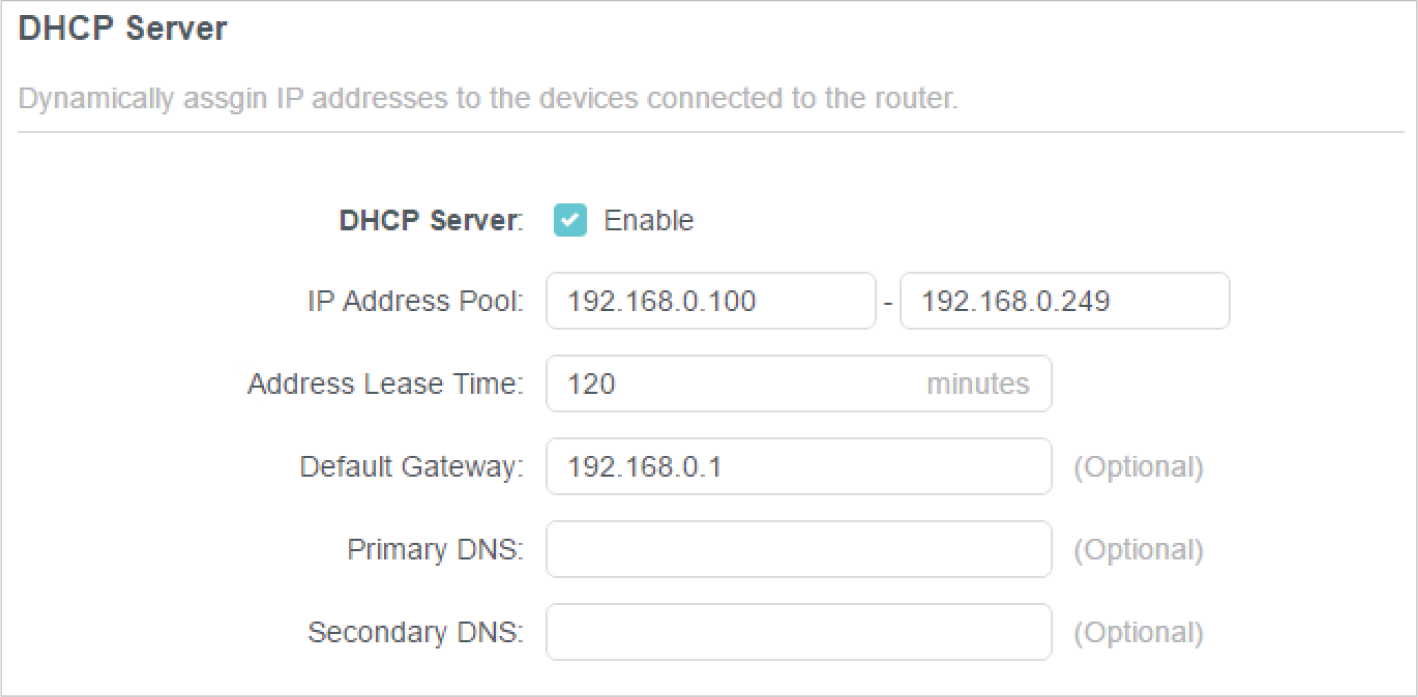 By default, the DHCP (Dynamic Host Configuration Protocol) Server is enabled and the router acts as a DHCP server; it dynamically assigns TCP/IP parameters to client devices from the IP Address Pool. You can change the settings of the DHCP Server if necessary, and you can reserve LAN IP addresses for specified client devices.