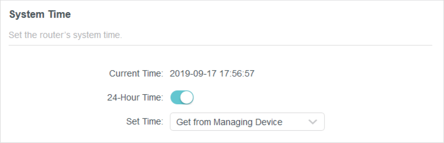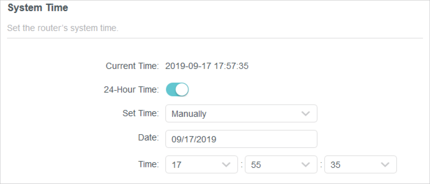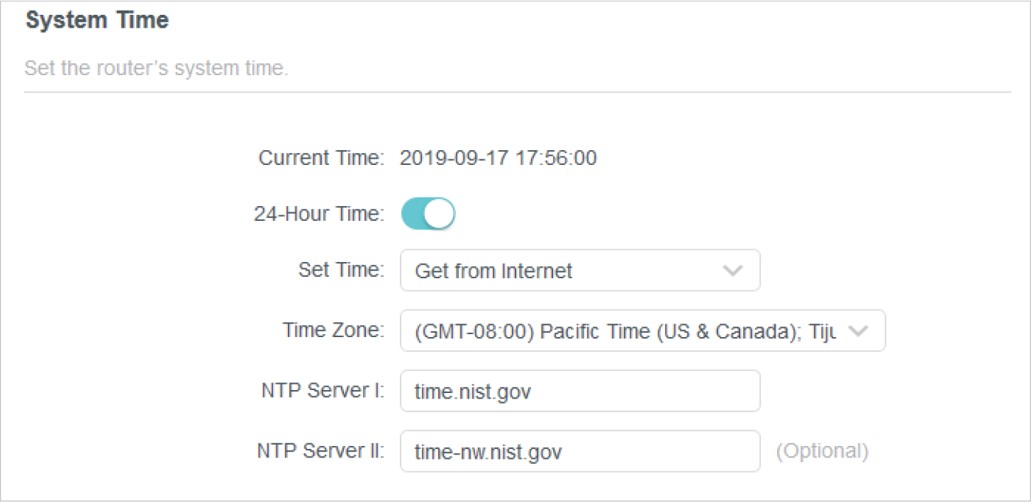 System time is the time displayed while the router is running. The system time you configure here will be used for other time-based functions like Parental Controls. You can choose the way to obtain the system time as needed.