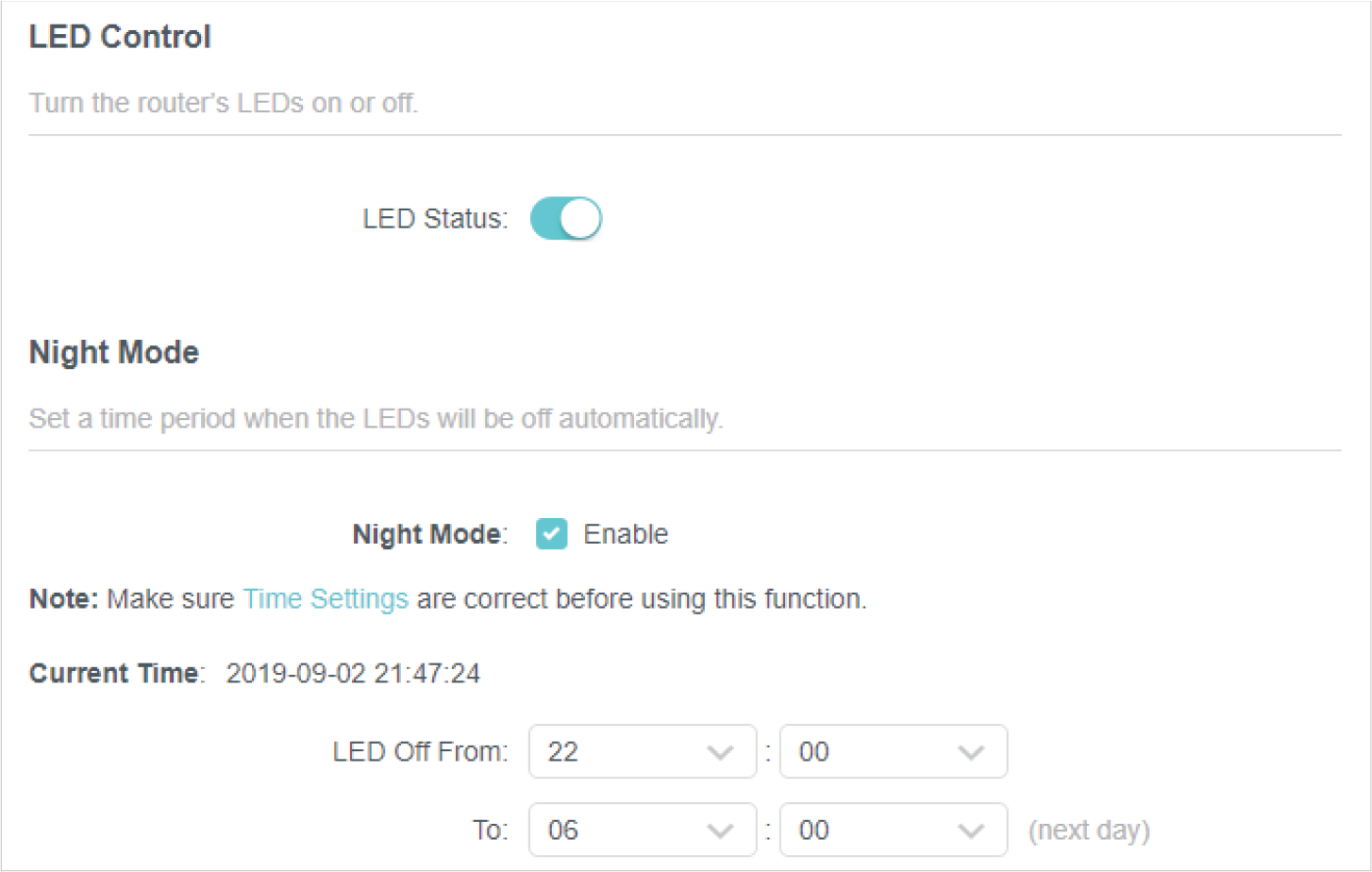 The LED of the router indicates its activities and status. You can enable the Night Mode feature to specify a time period during which the LED is off.