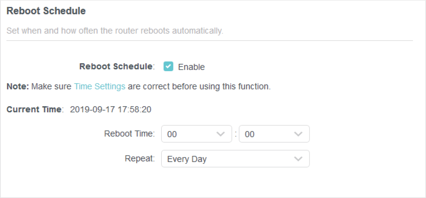 Specify the Reboot Time when the router reboots and Repeat to decide how often it reboots.