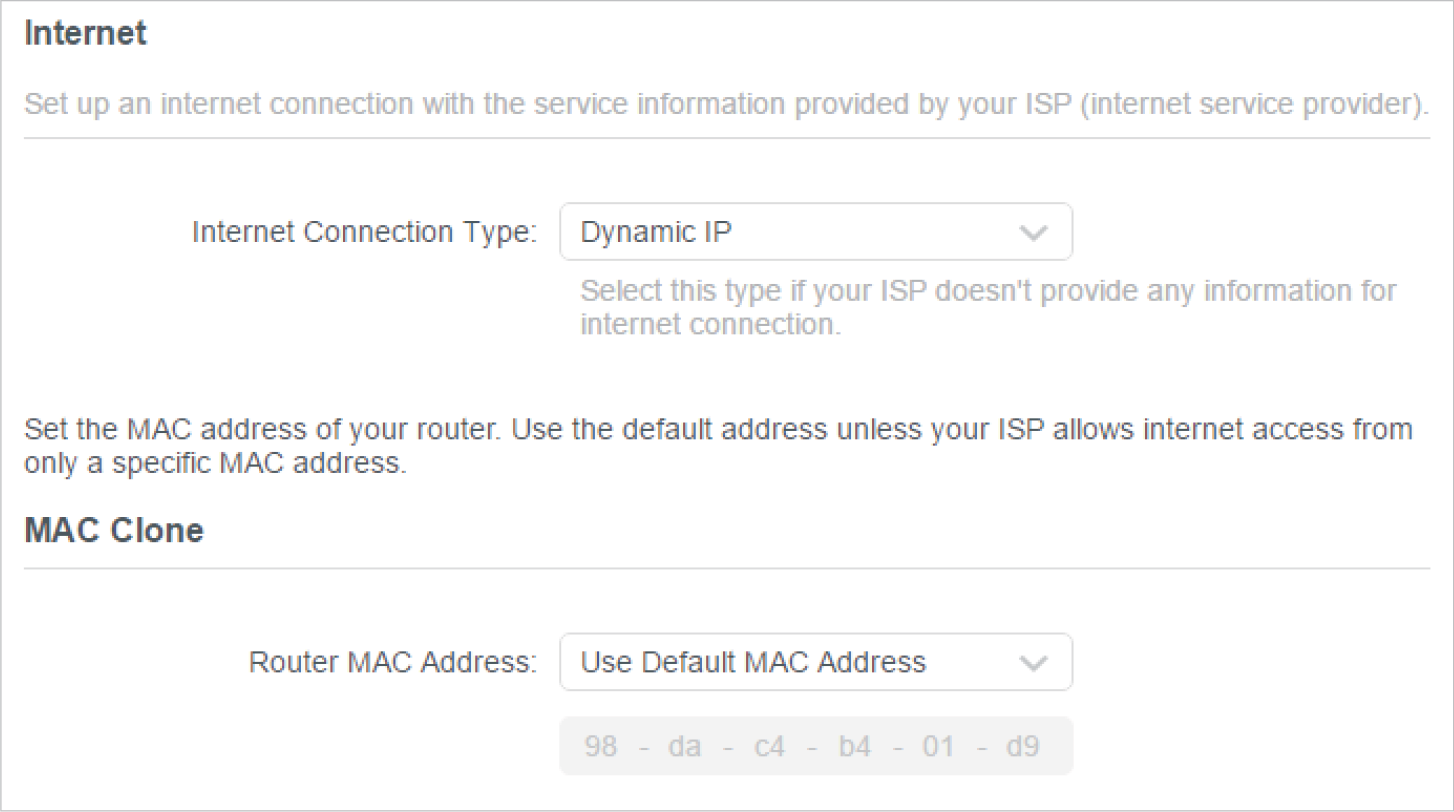 If you choose Dynamic IP, you need to select whether to clone the MAC address. Dynamic IP users are usually equipped with a cable TV or fiber cable.