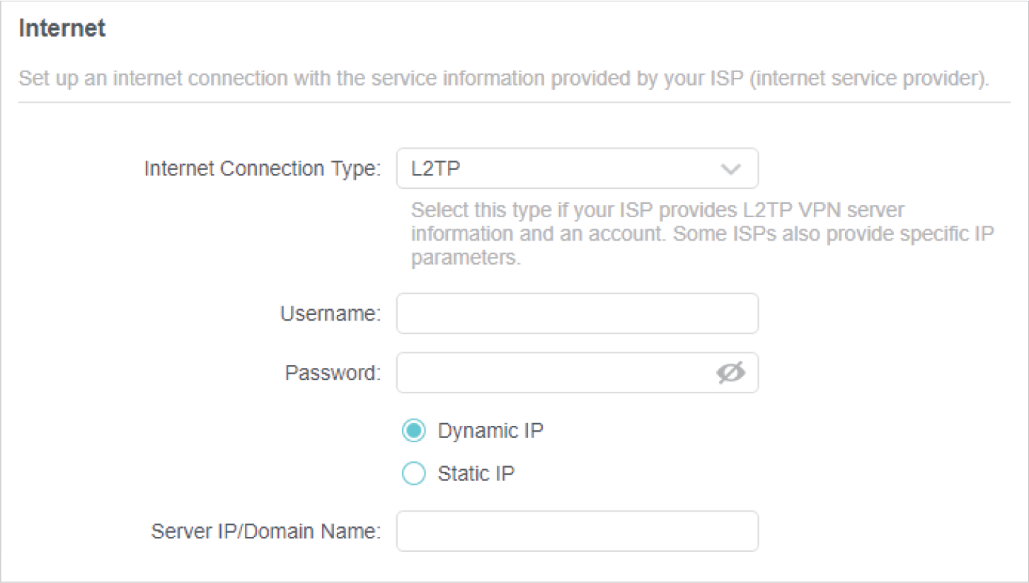 If you choose L2TP, enter the username and password and choose the Secondary Connection provided by your ISP. Different parameters are needed according to the Secondary Connection you have chosen.