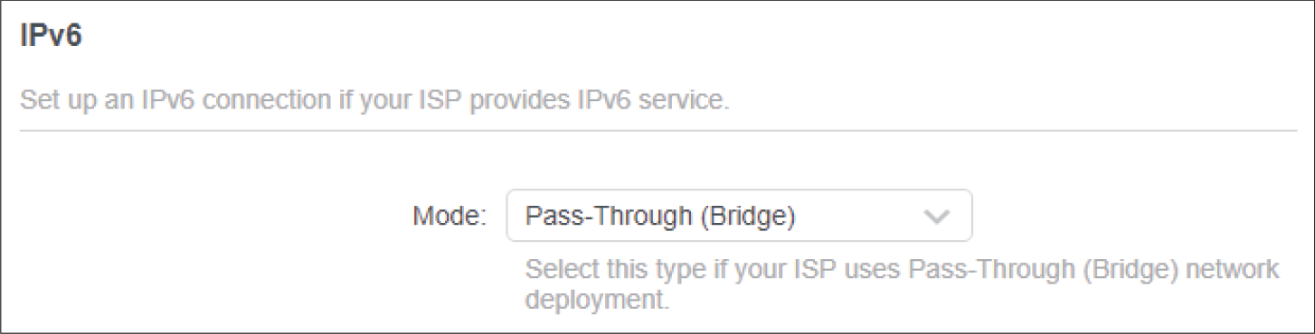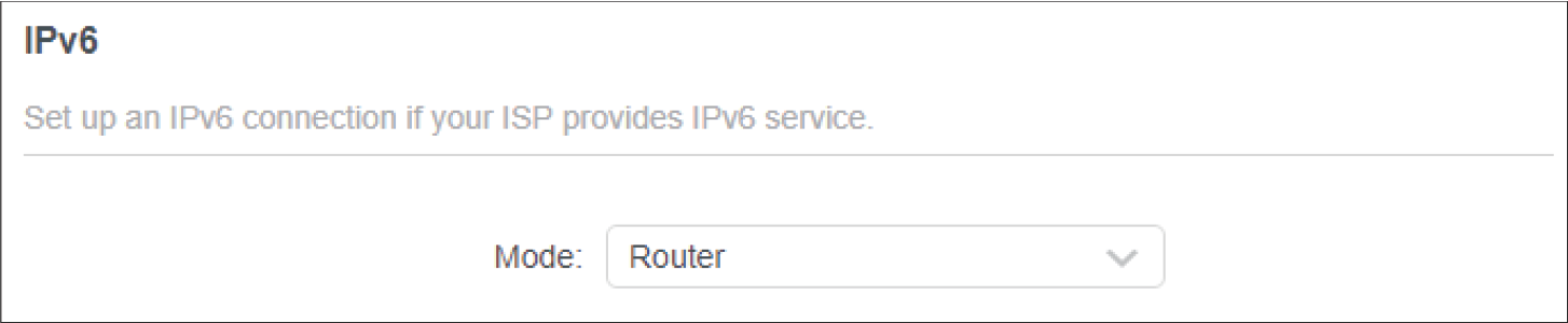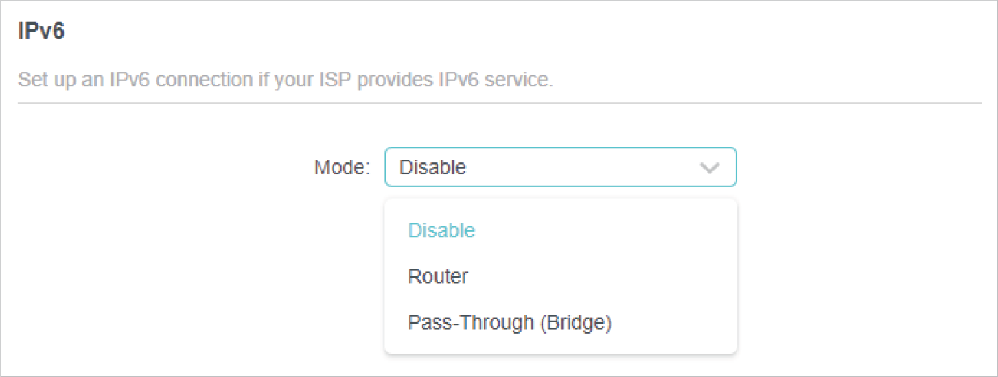 Select the mode provided by your ISP to enable IPv6 connection.